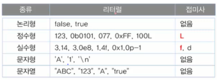 - float의 리터럴에는 f, double의 리터럴에는 d가 붙음