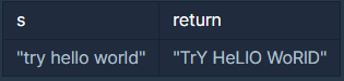"try hello world"는 세 단어 "try", "hello", "world"로 구성되어 있습니다. 각 단어의 짝수번째 문자를 대문자로, 홀수번째 문자를 소문자로 바꾸면 "TrY", "HeLlO", "WoRlD"입니다. 따라서 "TrY HeLlO WoRlD" 를 리턴합니다.