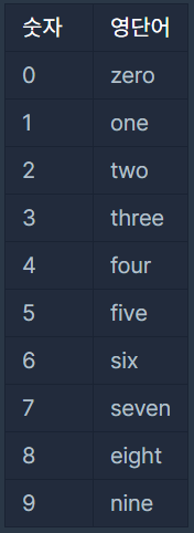 참고로 각 숫자에 대응되는 영단어는 다음 표와 같습니다.