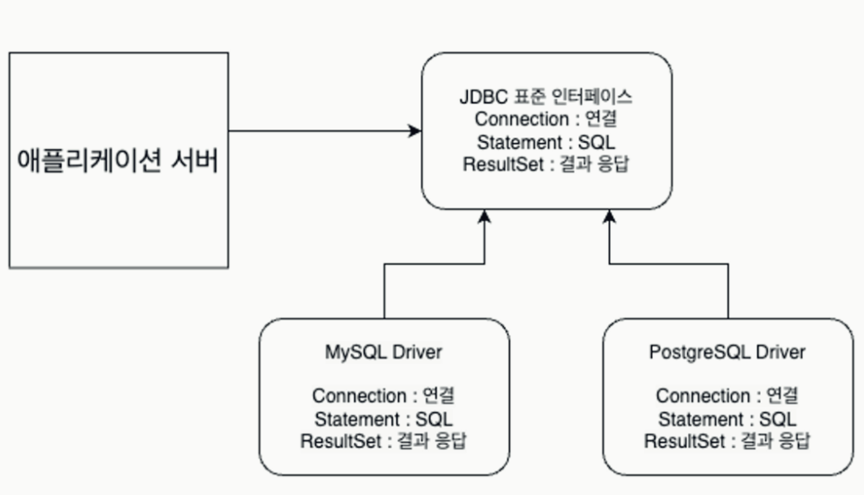 ➡️ MySQL 이 아닌 PostgreSQL 로 변경한다면 위의 3가지 방법이 모두 다를 수 있기 때문에 DB의 연결 로직들을 모두 수정해야 하는 문제가 발생하는데 이러한 문제를 해결하기 위해 JDBC 표준 인터페이스 등장