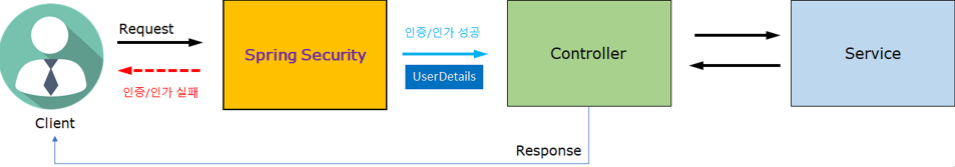 ➡️ Client요청 + 사용자 정보(UserDetails) - 실패시: Controller로 Client 요청 전달 ❌