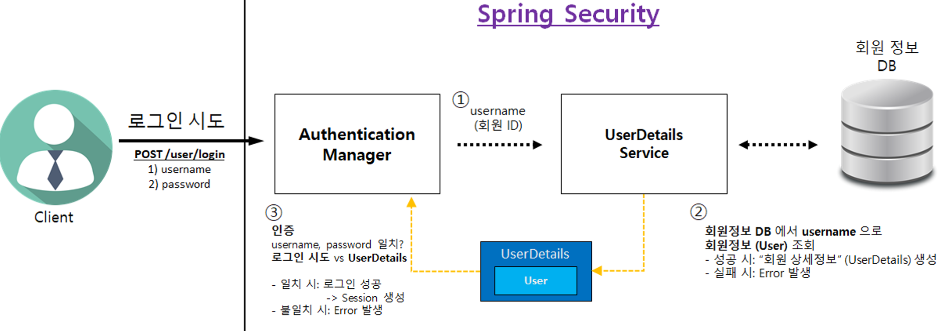 - ) UserDetailsService에게 username 전달하고 회원상세 정보 요청