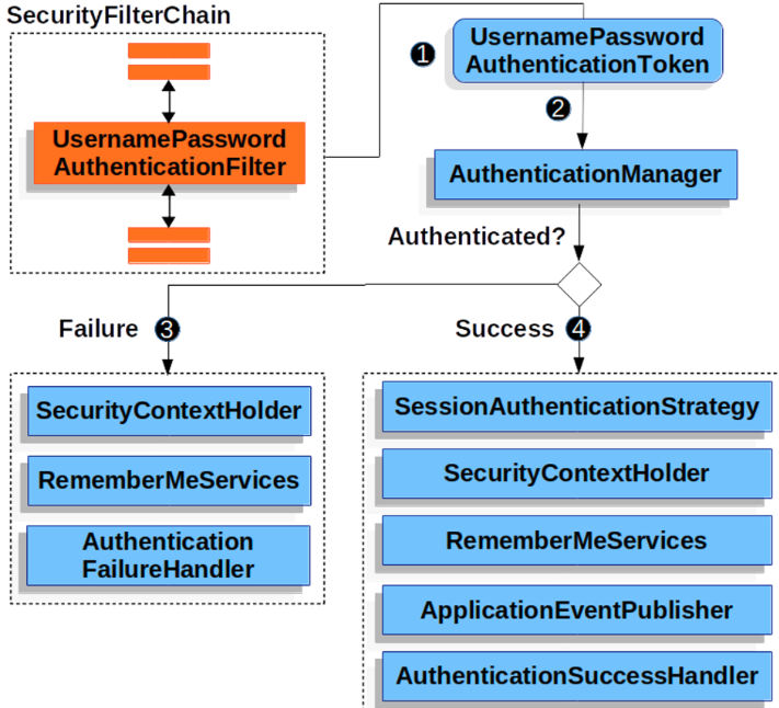- 사용자가 username과 password를 제출하면 UsernamePasswordAuthenticationFilter는 UsernamePasswordAuthenticationToken을 만들어 AuthenticationManager에게 넘겨 인증 시도