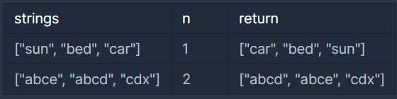 - 모든 strings의 원소의 길이는 n보다 큽니다.