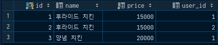 @Entity @Table(name = "food") public class Food { @Id @GeneratedValue(strategy = GenerationType.IDENTITY) private Long id; private String name; private double price; @ManyToOne @JoinColumn(name = "user_id") private User user; } - 고객