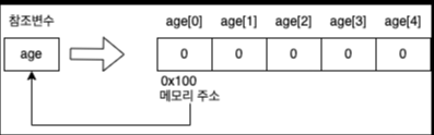 - 배열의 시작 주소(메모리 주소)가 참조변수 age에 저장되었고 age는 저장된 주소를 통해 해당 배열을 가리킨다.