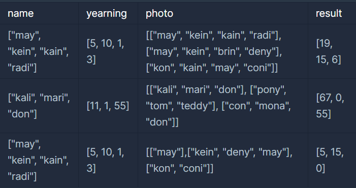 첫 번째 사진 속 "may", "kein", "kain", "radi"의 그리움 점수를 합치면 19(5 + 10 + 1 + 3)점 입니다. 두 번째 사진 속 그리워하는 사람들인 "may"와 "kein"의 그리움 점수를 합치면 15(5 + 10)점입니다. 세 번째 사진의 경우 "kain"과 "may"만 그리워하므로 둘의 그리움 점수를 합한 6(1 + 5)점이 사진의 추억 점수입니다. 따라서 [19, 15, 6]을 반환합니다.