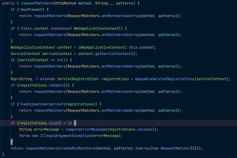 조회하는 부분에 대해서는 로그인을 하지 않아도 가능하게끔 하기위해 WebSecurityConfig 부분에 코드를 추가하고자 했다. 코드를 추가하려고 하던 중 수정관련 api와 특정글 선택시 조회하는 api가 같은 것을 볼 수 있었다. 이런 경우에는 어떻게 하지? 싶어 찾아본 결과 requestMatchers()의 patterns 인자 앞에 method 인자를 추가적으로 넣어주면 해당 문제를 해결할 수 있다는 것을 알게되었다.