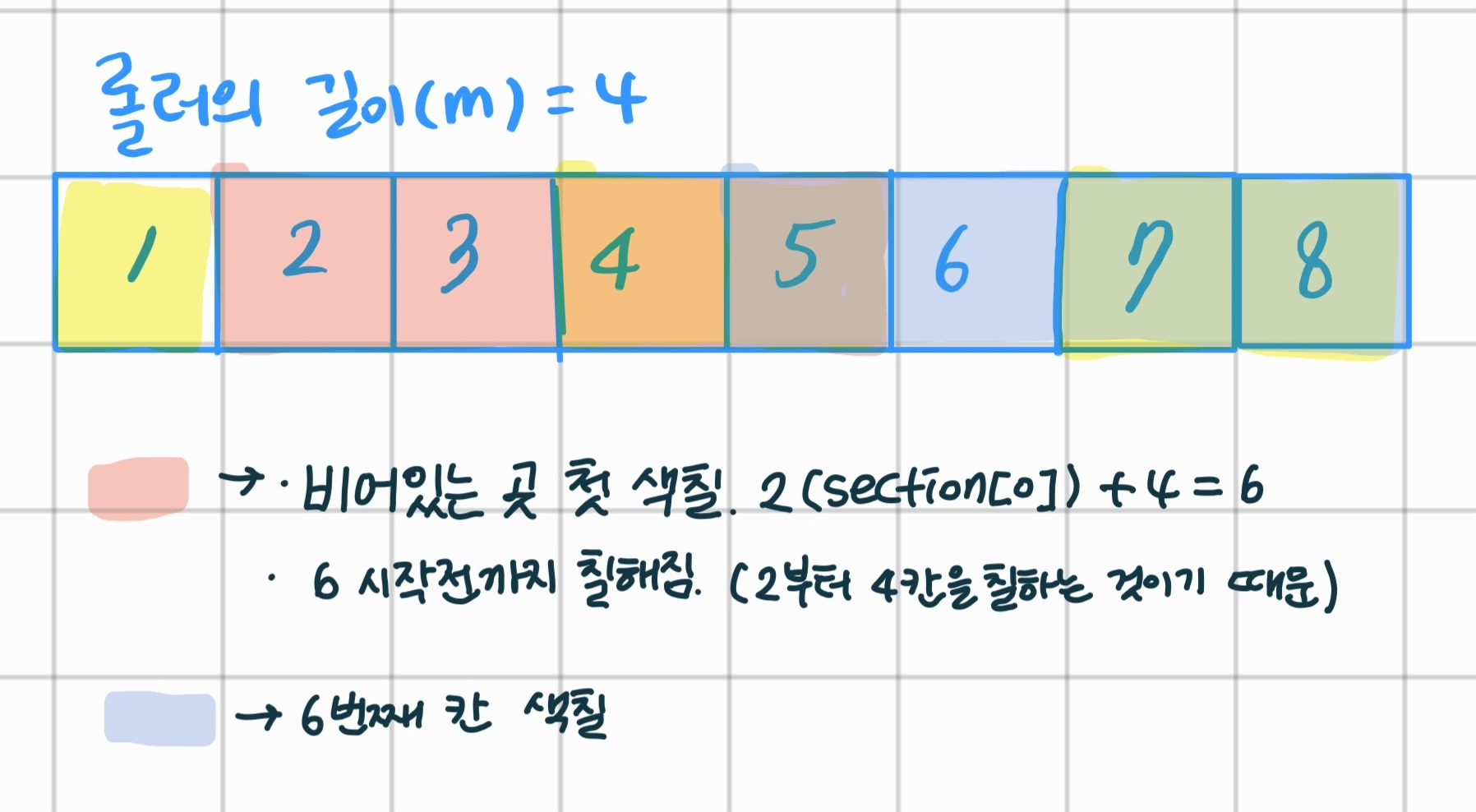 그렇기 때문에 채워지지 않은 벽 중 제일 앞쪽에 있는 벽의 수를 저장하는 변수인 notFull을 section[0] + m으로 초기화해준다. (section[0]은 이미 칠했다고 가정하여 answer을 1로 초기화해줬기 때문에 section[0]부터 시작해 롤러의 길이인 m만큼이 칠해져 section[0] + m으로 초기화 해준 것.)