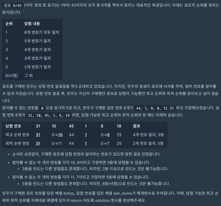 for문을 통해 lottos배열에 0이 있는지 확인하고 있다면 알 수 없는 번호로, 1~45까지의 숫자만 존재할 수 있는 win_nums에는 상관없기 때문에 unknown을 1만큼 증가시켜준 후, continue를 해준다.