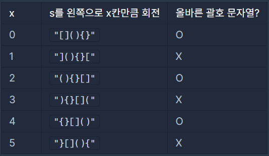 대괄호, 중괄호, 그리고 소괄호로 이루어진 문자열 s가 매개변수로 주어집니다. 이 s를 왼쪽으로 x (0 ≤ x < (s의 길이)) 칸만큼 회전시켰을 때 s가 올바른 괄호 문자열이 되게 하는 x의 개수를 return 하도록 solution 함수를 완성해주세요.
