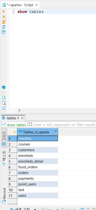 - scrpit에 show tables 를 적고 우클릭>실행>SQL문 실행(ctrl+enter)시 11개의 테이블이 있는 것을 확인할 수 있음