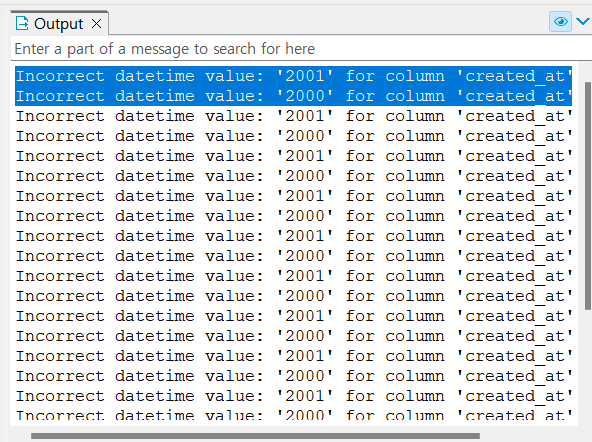위의 사진처럼 " Incorrect datetime value: '2001' for column 'created_at' at row 1 "과 같은 오류가 여러 개 발생하였다. 에러 메시지 확인 후 작성한 sql문을 유심히 보니 강의에서 강조해서 말씀해주셨던 따옴표로 감싸주지 않은 것이 문제임을 깨닫고 아래의 코드와 같이 수정 후 다시 실행하였더니 문제가 해결되었다.