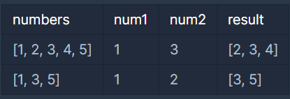 정수 배열 numbers와 정수 num1, num2가 매개변수로 주어질 때, numbers의 num1번 째 인덱스부터 num2번째 인덱스까지 자른 정수 배열을 return 하도록 solution 함수를 완성해보세요.