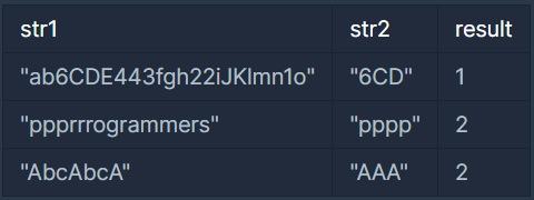 - "ppprrrogrammers" str1에 str2가 없으므로 2를 return합니다.