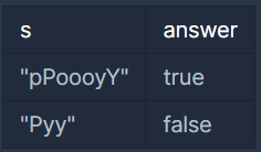 - 'p'의 개수 1개, 'y'의 개수 2개로 다르므로 false를 return 합니다.